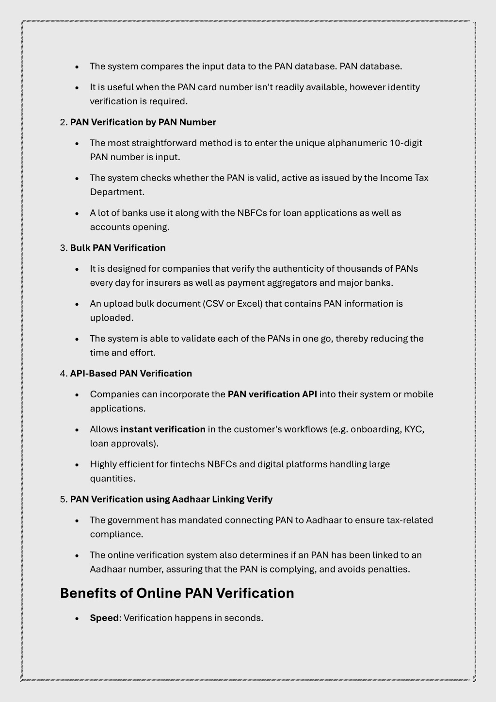 2. •The system compares the input data to the PAN database. PAN database. •It is useful when the PAN card number isn't readily available, however identity verification is required. 2.PAN Verification by PAN Number •The most straightforward method is to enter the unique alphanumeric 10-digit PAN number is input. •The system checks whether the PAN is valid, active as issued by the Income Tax Department. •A lot of banks use it along with the NBFCs for loan applications as well as accounts opening. 3.Bulk PAN Verification •It is designed for companies that verify the authenticity of thousands of PANs every day for insurers as well as payment aggregators and major banks. •An upload bulk document (CSV or Excel) that contains PAN information is uploaded. •The system is able to validate each of the PANs in one go, thereby reducing the time and effort. 4.API-Based PAN Verification •Companies can incorporate thePAN verification APIinto their system or mobile applications. •Allowsinstant verificationin the customer's workflows (e.g. onboarding, KYC, loan approvals). •Highly efficient for fintechs NBFCs and digital platforms handling large quantities. 5.PAN Verification using Aadhaar Linking Verify •The government has mandated connecting PAN to Aadhaar to ensure tax-related compliance. •The online verification system also determines if an PAN has been linked to an Aadhaar number, assuring that the PAN is complying, and avoids penalties. Benefits of Online PAN Verification •Speed: Verification happens in seconds.