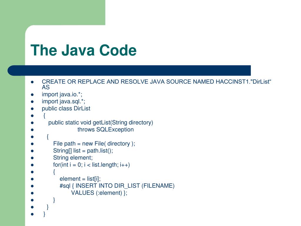 The Java Code • CREATE OR REPLACE AND RESOLVE JAVA SOURCE NAMED HACCINST1."DirList“ AS • import java.io.*; • import java.sql.*; • public class DirList • { • public static void getList(String directory) • throws SQLException • { • File path = new File( directory ); • String[] list = path.list(); • String element; • for(int i = 0; i < list.length; i++) • { • element = list[i]; • #sql { INSERT INTO DIR_LIST (FILENAME) • VALUES (:element) }; • } • } • }