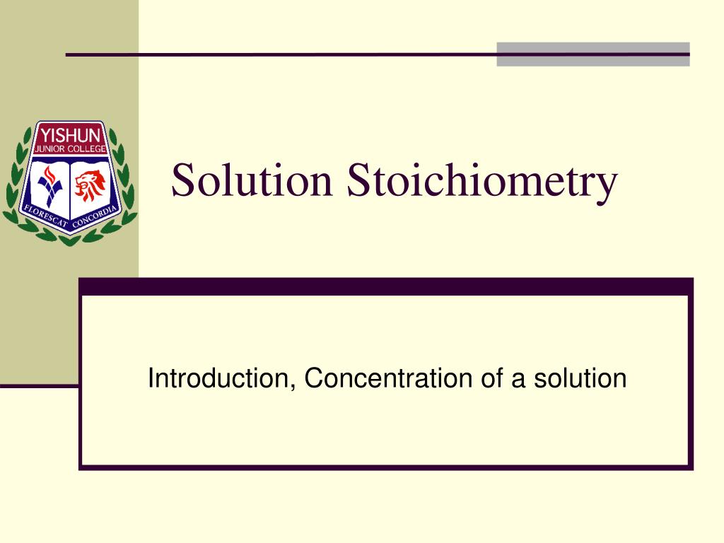 Solution Stoichiometry. Introduction, Concentration of a solution. What will I learn?. What is solution stoichiometry? Define the following terms: solution; solute; solvent; and concentration Calculate concentration based on the amount of solute and the total volume