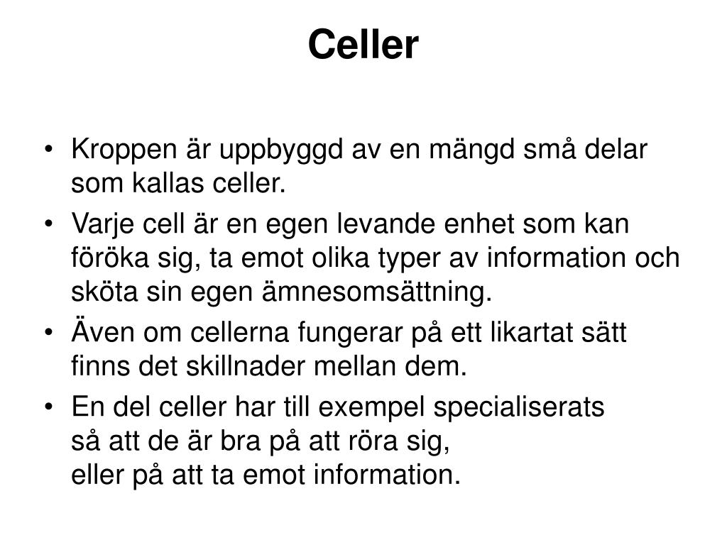 Celler • Kroppen är uppbyggd av en mängd små delar som kallas celler. • Varje cell är en egen levande enhet som kan föröka sig, ta emot olika typer av information och sköta sin egen ämnesomsättning. • Även om cellerna fungerar på ett likartat sätt finns det skillnader mellan dem. • En del celler har till exempel specialiserats så att de är bra på att röra sig, eller på att ta emot information.