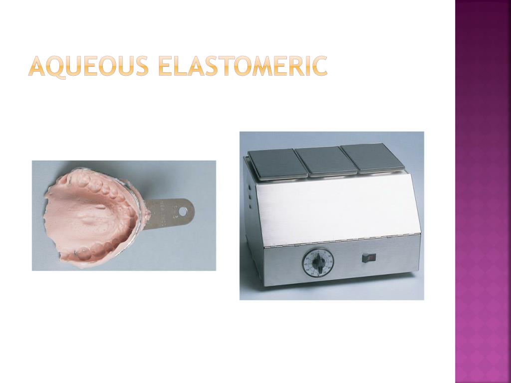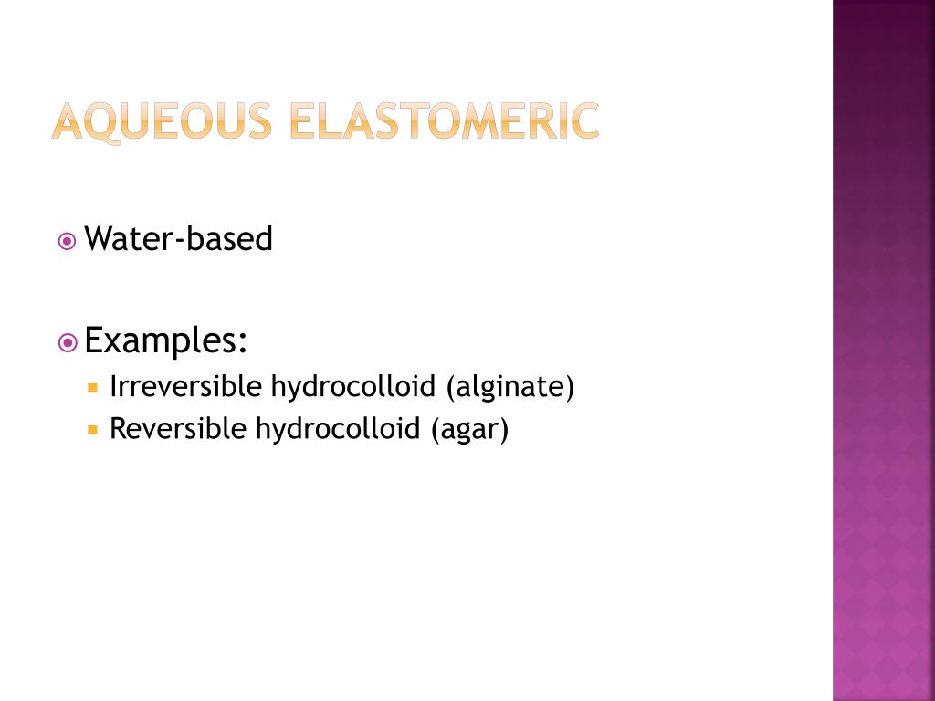 Aqueous Elastomeric • Water-based • Examples: • Irreversible hydrocolloid (alginate) • Reversible hydrocolloid (agar)