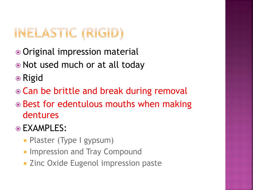 INELASTIC (Rigid) • Original impression material • Not used much or at all today • Rigid • Can be brittle and break during removal • Best for edentulous mouths when making dentures • EXAMPLES: • Plaster (Type I gypsum) • Impression and Tray Compound • Zinc Oxide Eugenol impression paste
