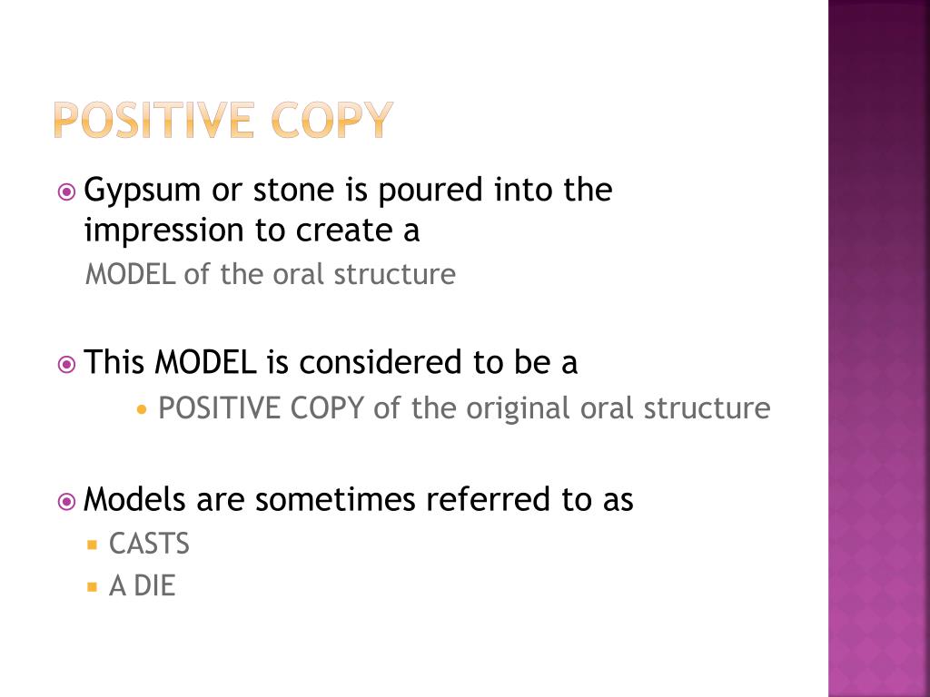 Positive Copy • Gypsum or stone is poured into the impression to create a MODEL of the oral structure • This MODEL is considered to be a • POSITIVE COPY of the original oral structure • Models are sometimes referred to as • CASTS • A DIE