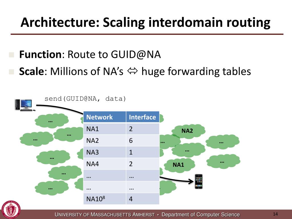 Architecture: Scaling interdomain routing • Function: Route to GUID@NA • Scale: Millions of NA’s huge forwarding tables send(GUID@NA, data) … … … NA2 … … NA3 … … … … … … … … NA1 … … … … … … …