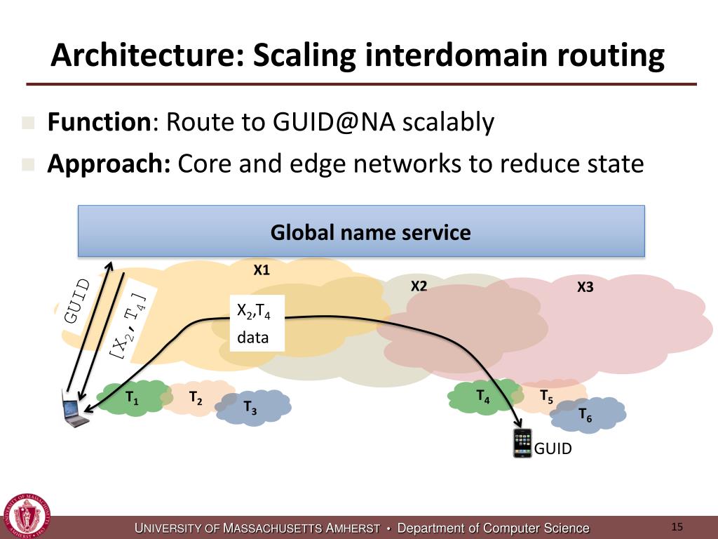 Architecture: Scaling interdomain routing • Function: Route to GUID@NA scalably • Approach: Core and edge networks to reduce state Global name service GUID [X2,T4] T4 T5 T1 T2 T3 T6 GUID X2,T4 data X1 X2 X3