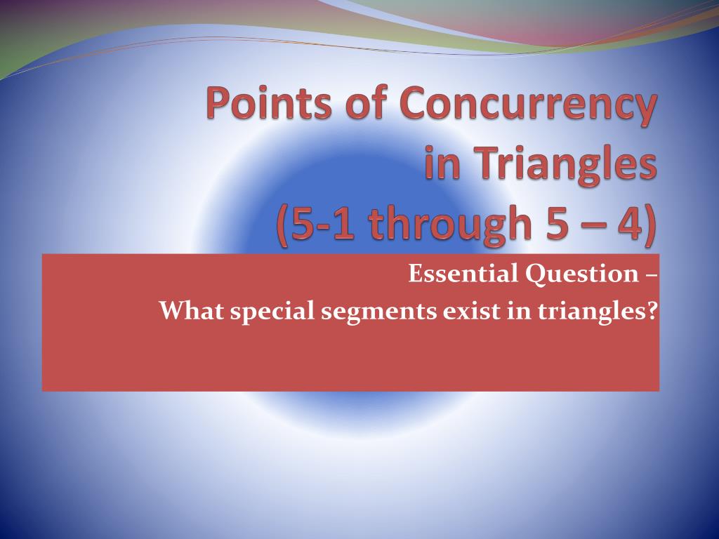 Points of Concurrency in Triangles(5-1 through 5 – 4) Essential Question – What special segments exist in triangles?