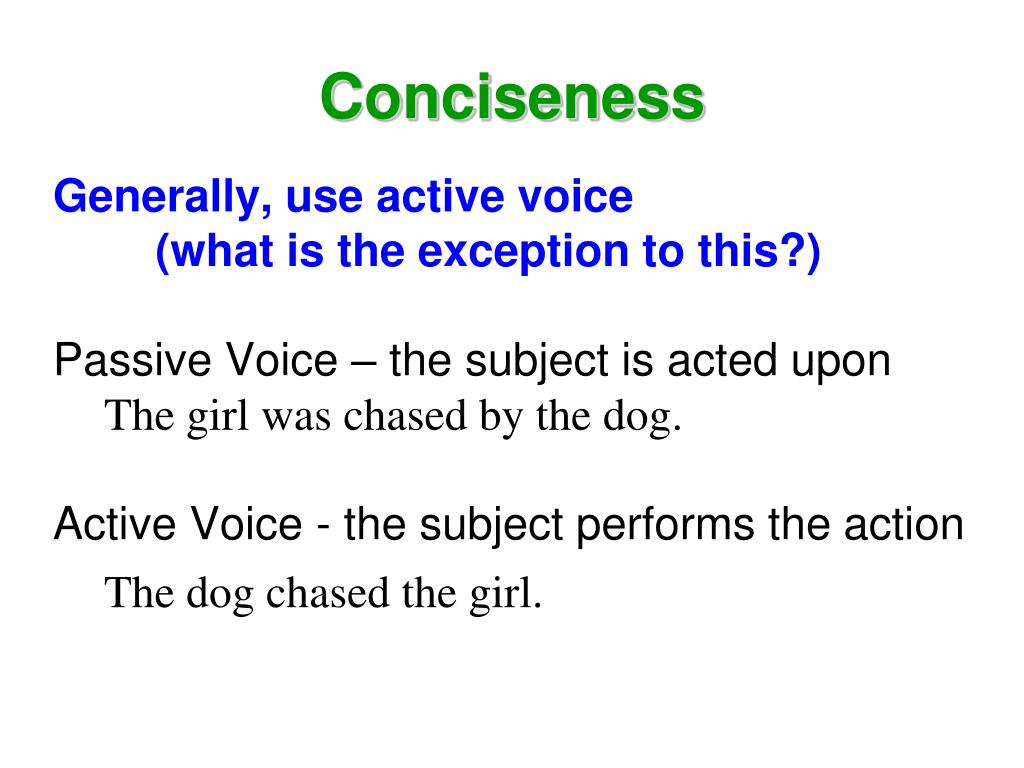 Conciseness Generally, use active voice (what is the exception to this?) Passive Voice – the subject is acted upon The girl was chased by the dog. Active Voice - the subject performs the action The dog chased the girl.