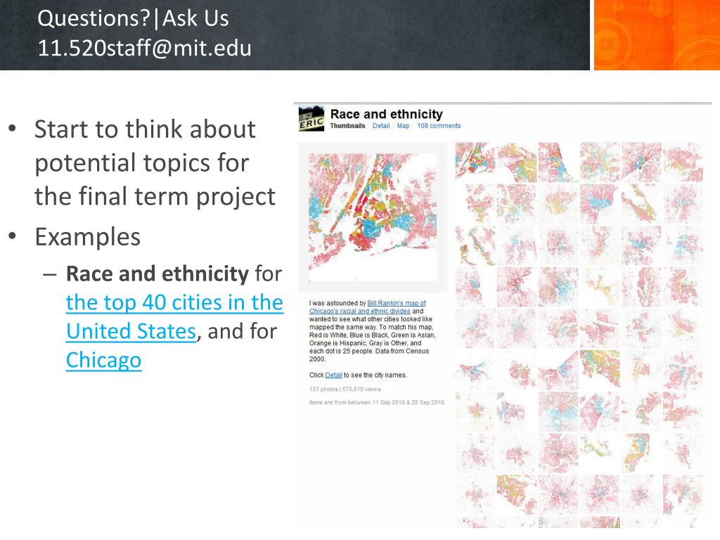 Questions?|Ask Us11.520staff@mit.edu • Start to think about potential topics for the final term project • Examples • Race and ethnicity for the top 40 cities in the United States, and for Chicago