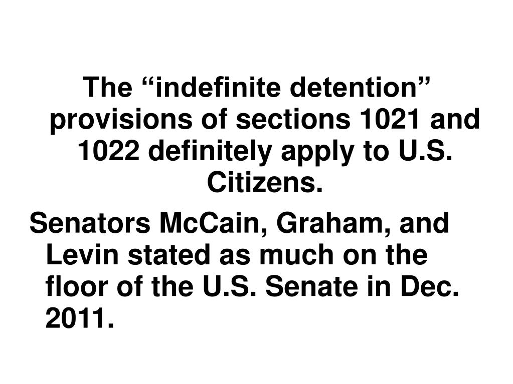 The “indefinite detention” provisions of sections 1021 and 1022 definitely apply to U.S. Citizens. Senators McCain, Graham, and Levin stated as much on the floor of the U.S. Senate in Dec. 2011.