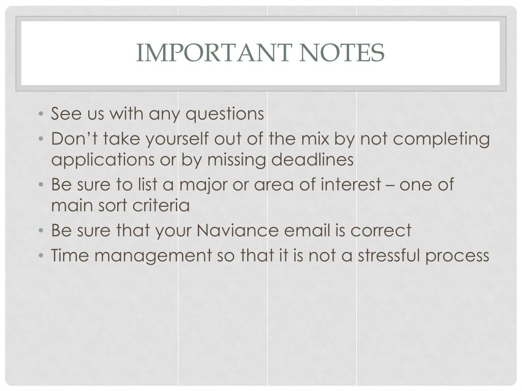 Important Notes • See us with any questions • Don’t take yourself out of the mix by not completing applications or by missing deadlines • Be sure to list a major or area of interest – one of main sort criteria • Be sure that your Naviance email is correct • Time management so that it is not a stressful process