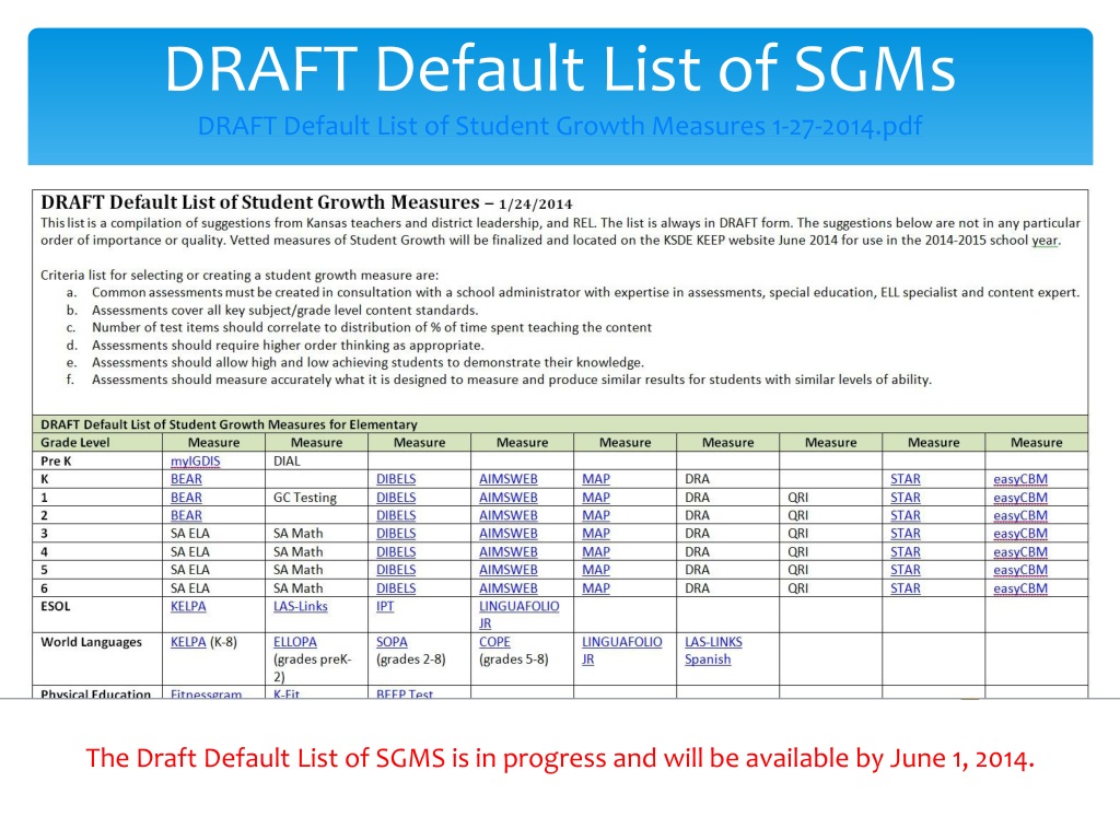 Next steps: All districts will identify student growth measures to be used and provide them to the KSDE (in a format to be determined) by June 30, 2014. A “default list” of student growth measures for LEA reference will be available and posted on the web by May 1, 2014.