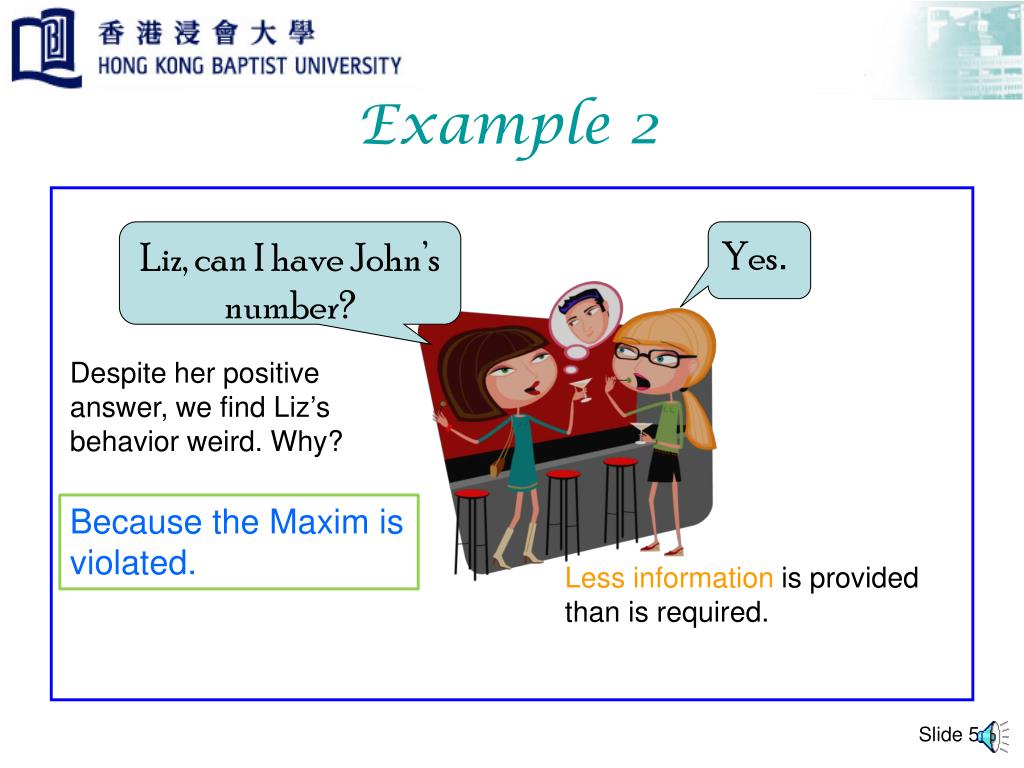 Example 2 Liz, can I have John’s number? Yes. Despite her positive answer, we find Liz’s behavior weird. Why? Because the Maxim is violated. Less information is provided than is required. Slide 5