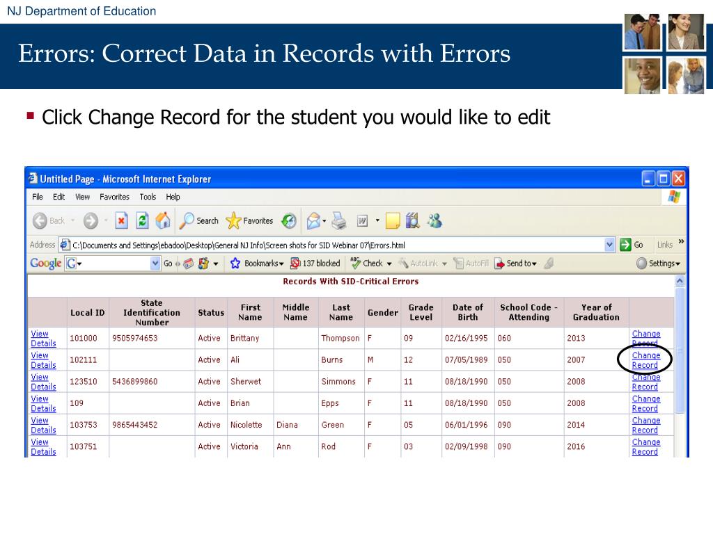Errors: Correct Data in Records with Errors • Click Change Record for the student you would like to edit