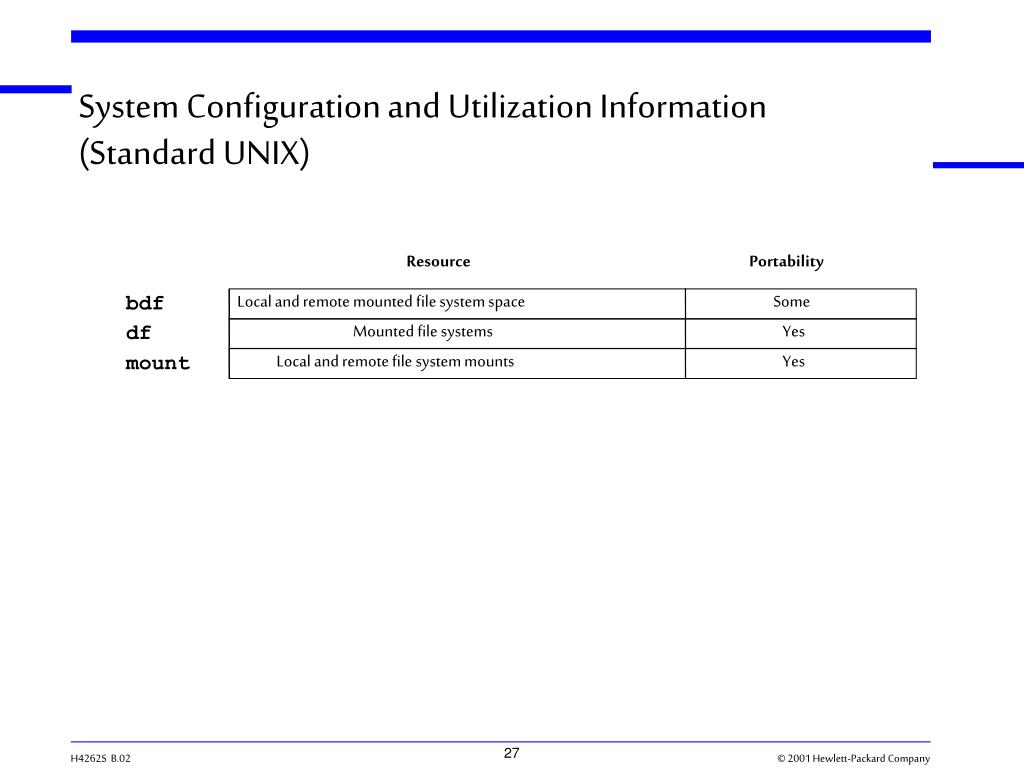 System Configuration and Utilization Information (Standard UNIX) Resource Portability Local and remote mounted file system space Some bdf Mounted file systems Yes df Local and remote file system mounts Yes mount