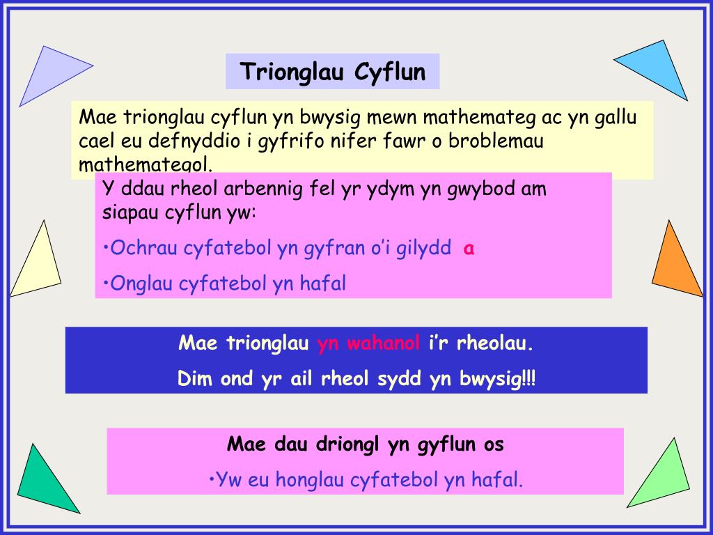 Trionglau Cyflun Mae trionglau cyflun yn bwysig mewn mathemateg ac yn gallu cael eu defnyddio i gyfrifo nifer fawr o broblemau mathemategol. • Y ddau rheol arbennig fel yr ydym yn gwybod am siapau cyflun yw: • Ochrau cyfatebol yn gyfran o’i gilydd a • Onglau cyfatebol yn hafal Mae trionglau yn wahanol i’r rheolau. Dim ond yr ail rheol sydd yn bwysig!!! • Mae dau driongl yn gyflun os • Yw eu honglau cyfatebol yn hafal.