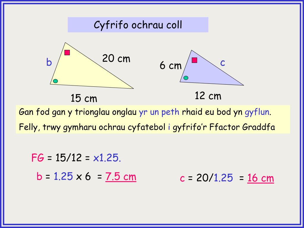 Cyfrifo ochrau coll 20 cm b c 6 cm 12 cm 15 cm Gan fod gan y trionglau onglau yr un peth rhaid eu bod yn gyflun. Felly, trwy gymharu ochrau cyfatebol i gyfrifo’r Ffactor Graddfa FG = 15/12 = x1.25. b = 1.25 x 6 = 7.5 cm c = 20/1.25 = 16 cm