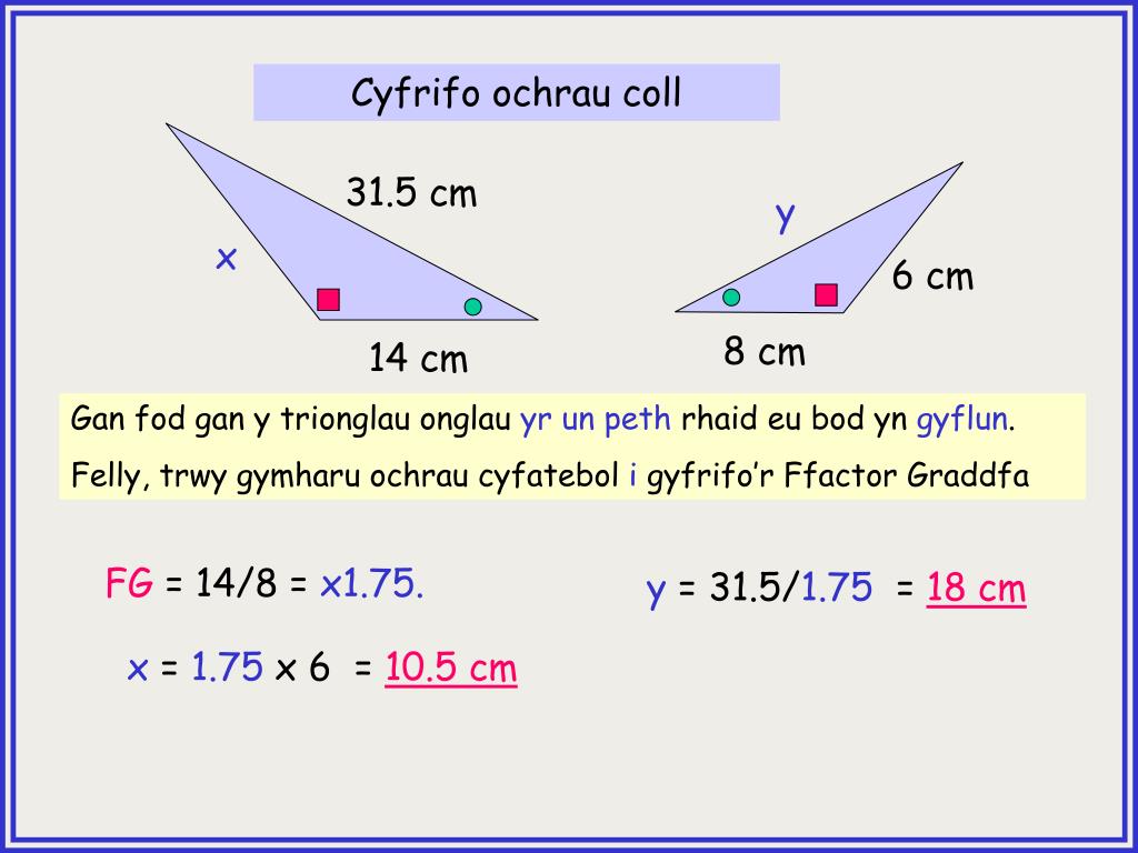 31.5 cm y x 6 cm 8 cm 14 cm Cyfrifo ochrau coll Gan fod gan y trionglau onglau yr un peth rhaid eu bod yn gyflun. Felly, trwy gymharu ochrau cyfatebol i gyfrifo’r Ffactor Graddfa FG = 14/8 = x1.75. y = 31.5/1.75 = 18 cm x = 1.75 x 6 = 10.5 cm