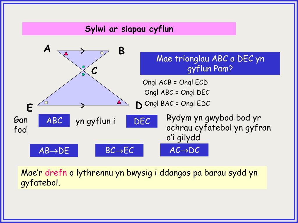 Sylwi ar siapau cyflun A B Mae trionglau ABC a DEC yn gyflun Pam? C Ongl ACB = Ongl ECD Ongl ABC = Ongl DEC D Ongl BAC = Ongl EDC E Rydym yn gwybod bod yr ochrau cyfatebol yn gyfran o’i gilydd Gan fod ABC yn gyflun i DEC ACDC BCEC ABDE Mae’r drefn o lythrennu yn bwysig i ddangos pa barau sydd yn gyfatebol.