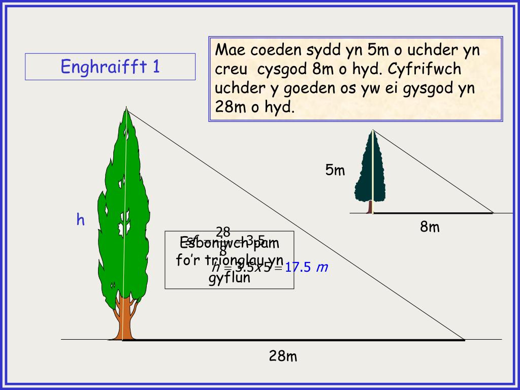 Mae coeden sydd yn 5m o uchder yn creu cysgod 8m o hyd. Cyfrifwch uchder y goeden os yw ei gysgod yn 28m o hyd. Enghraifft 1 5m h 8m 28m Esboniwch pam fo’r trionglau yn gyflun