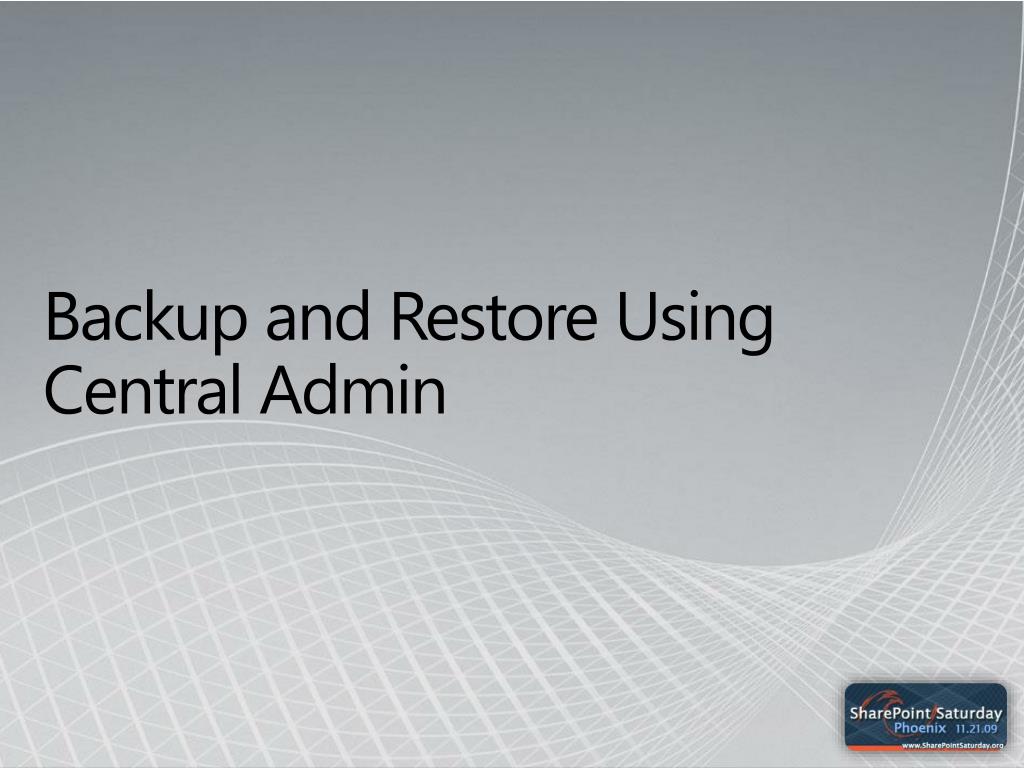 Backup – Site or List • Now possible from within Central Admin • SharePoint exports the identified site or list by performing multiple SQL SELECT statements to collect data, then writing data to a package • Optional: Use PowerShell (export-SPWeb) with the UseSqlSnapshot parameter