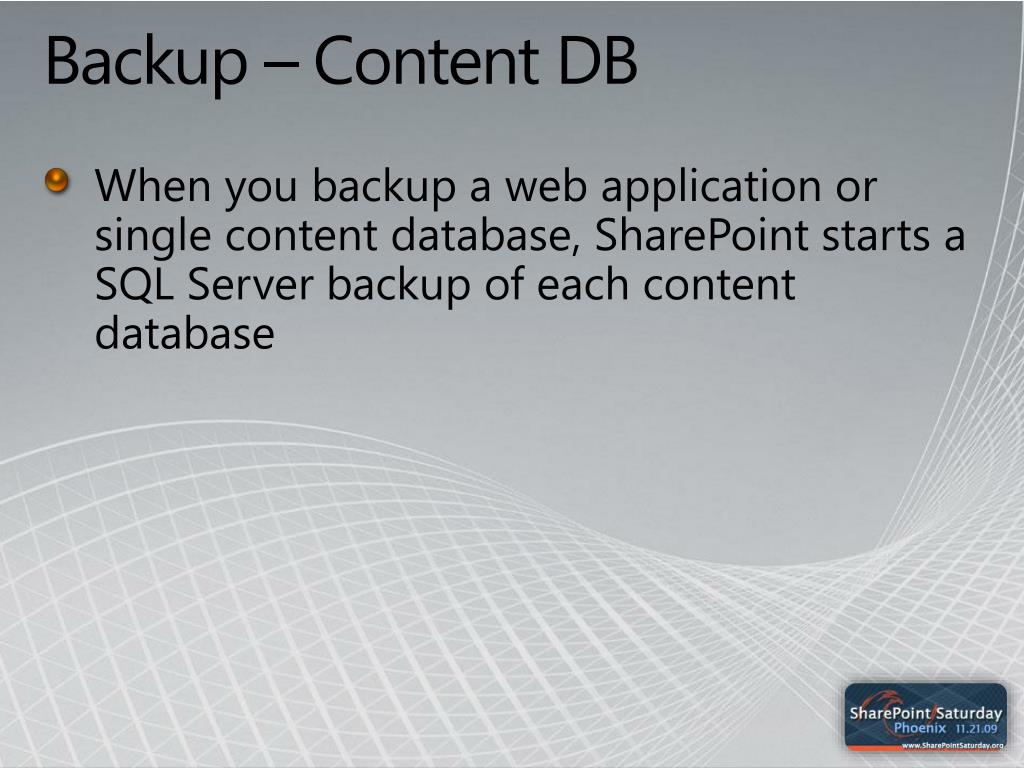Backup – Content DB • When you backup a web application or single content database, SharePoint starts a SQL Server backup of each content database