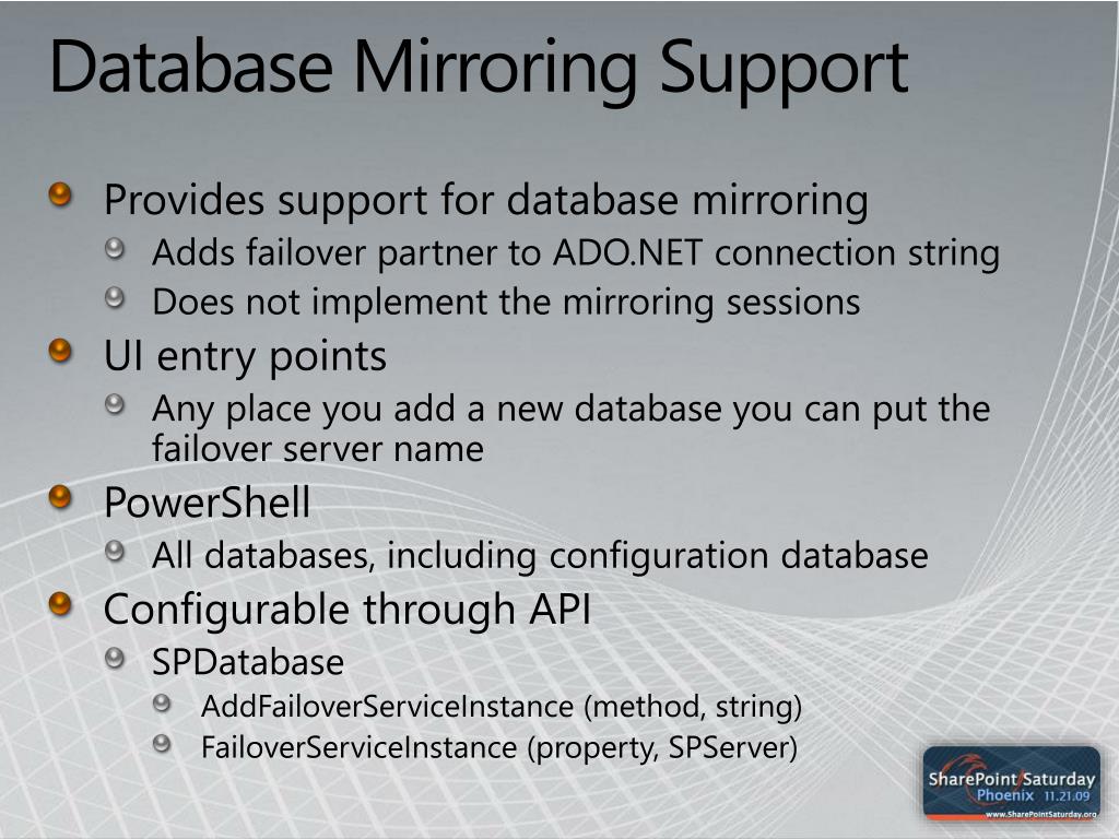 Database Mirroring Support • Provides support for database mirroring • Adds failover partner to ADO.NET connection string • Does not implement the mirroring sessions • UI entry points • Any place you add a new database you can put the failover server name • PowerShell • All databases, including configuration database • Configurable through API • SPDatabase • AddFailoverServiceInstance (method, string) • FailoverServiceInstance (property, SPServer)