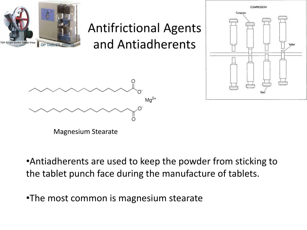 Antifrictional Agents and Antiadherents Magnesium Stearate • Antiadherents are used to keep the powder from sticking to the tablet punch face during the manufacture of tablets. • The most common is magnesium stearate