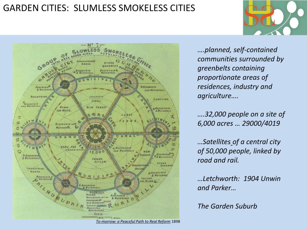 GARDEN CITIES: SLUMLESS SMOKELESS CITIES. ….planned, self-contained communities surrounded by greenbelts containing proportionate areas of residences, industry and agriculture…. ….32,000 people on a site of 6,000 acres … 29000/4019
