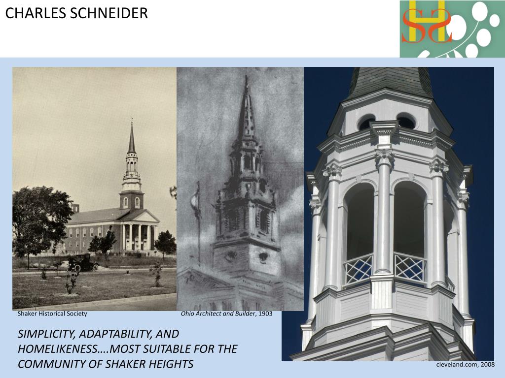 CHARLES SCHNEIDER Shaker Historical Society Ohio Architect and Builder, 1903 SIMPLICITY, ADAPTABILITY, AND HOMELIKENESS….MOST SUITABLE FOR THE COMMUNITY OF SHAKER HEIGHTS cleveland.com, 2008