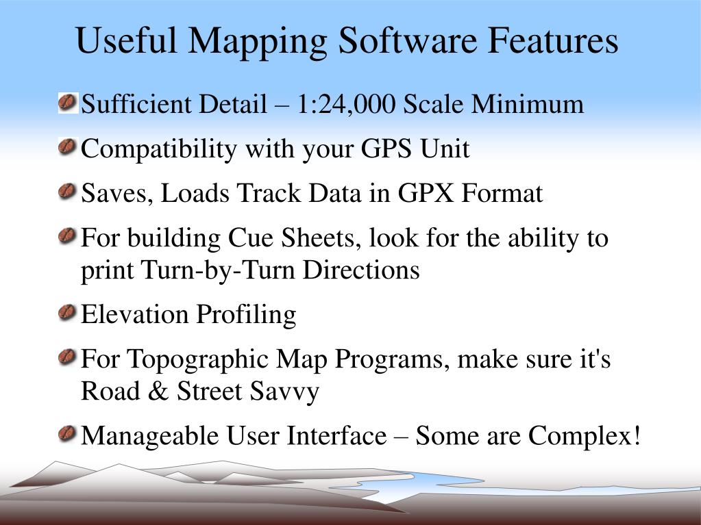 Useful Mapping Software Features • Sufficient Detail – 1:24,000 Scale Minimum • Compatibility with your GPS Unit • Saves, Loads Track Data in GPX Format • For building Cue Sheets, look for the ability to print Turn-by-Turn Directions • Elevation Profiling • For Topographic Map Programs, make sure it's Road & Street Savvy • Manageable User Interface – Some are Complex!