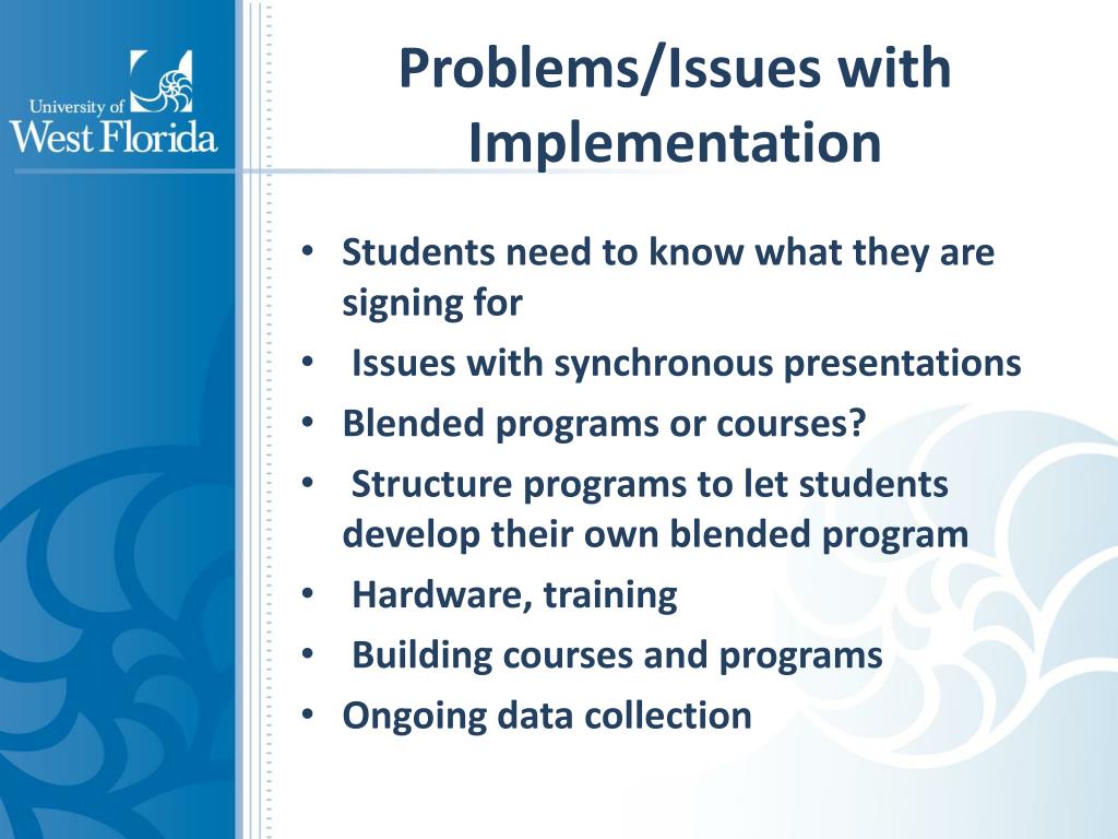 Problems/Issues with Implementation • Students need to know what they are signing for • Issues with synchronous presentations • Blended programs or courses? • Structure programs to let students develop their own blended program • Hardware, training • Building courses and programs • Ongoing data collection