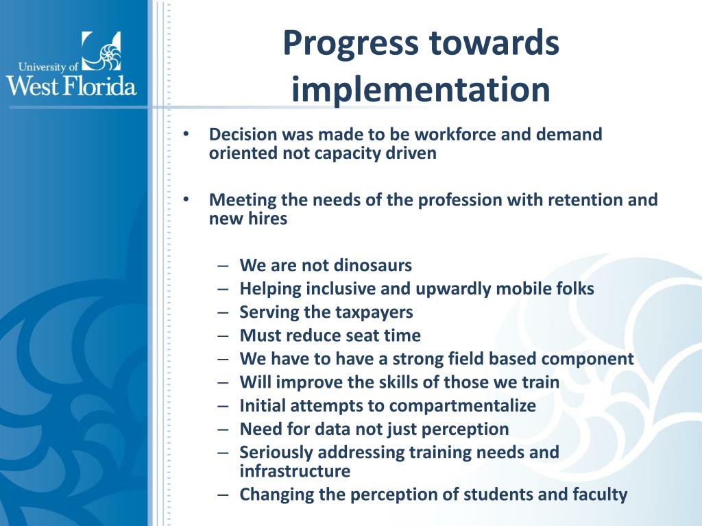 Progress towards implementation • Decision was made to be workforce and demand oriented not capacity driven • Meeting the needs of the profession with retention and new hires • We are not dinosaurs • Helping inclusive and upwardly mobile folks • Serving the taxpayers • Must reduce seat time • We have to have a strong field based component • Will improve the skills of those we train • Initial attempts to compartmentalize • Need for data not just perception • Seriously addressing training needs and infrastructure • Changing the perception of students and faculty
