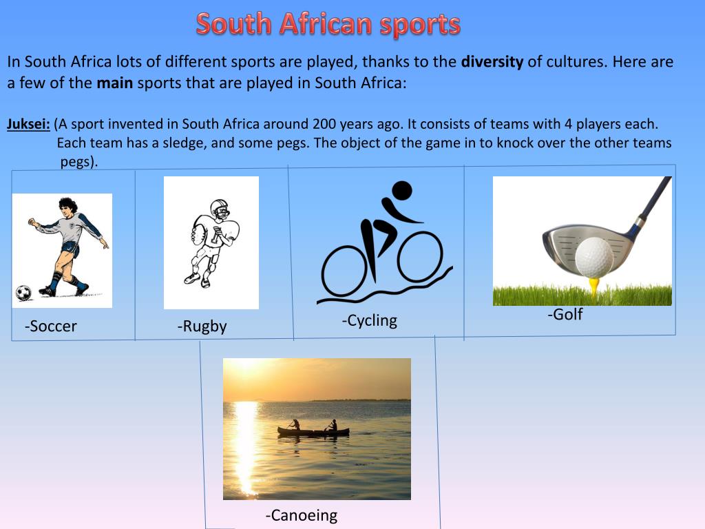 South African sports In South Africa lots of different sports are played, thanks to the diversity of cultures. Here are a few of the main sports that are played in South Africa: Juksei: (A sport invented in South Africa around 200 years ago. It consists of teams with 4 players each. Each team has a sledge, and some pegs. The object of the game in to knock over the other teams pegs). -Golf -Cycling -Soccer -Rugby -Canoeing
