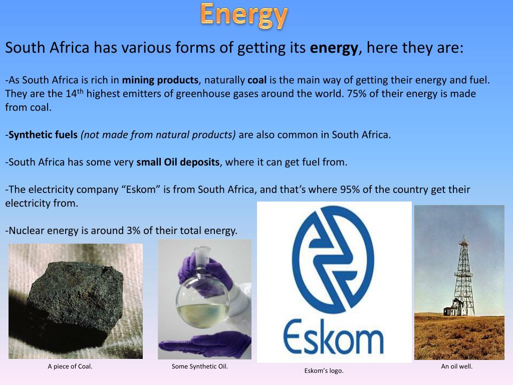 Energy South Africa has various forms of getting its energy, here they are: -As South Africa is rich in mining products, naturally coal is the main way of getting their energy and fuel. They are the 14th highest emitters of greenhouse gases around the world. 75% of their energy is made from coal. -Synthetic fuels (not made from natural products) are also common in South Africa. -South Africa has some very small Oil deposits, where it can get fuel from. -The electricity company “Eskom” is from South Africa, and that’s where 95% of the country get their electricity from. -Nuclear energy is around 3% of their total energy. A piece of Coal. Some Synthetic Oil. An oil well. Eskom’s logo.