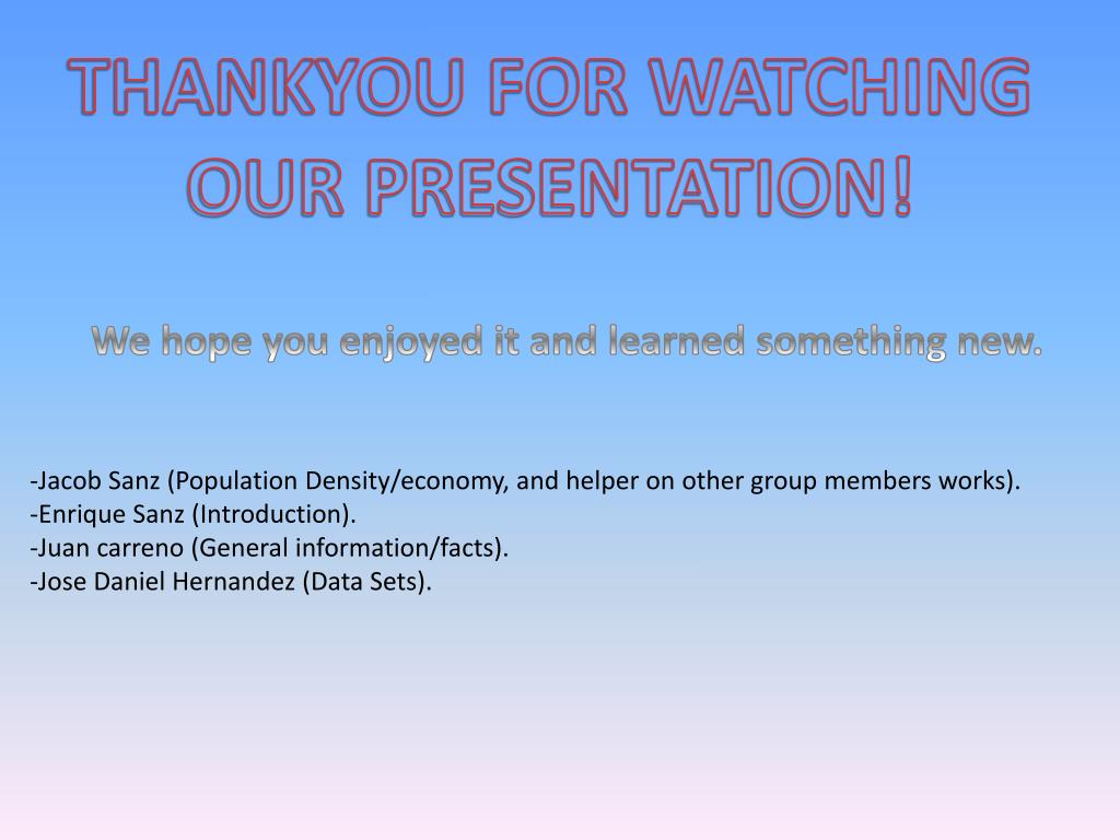 THANKYOU FOR WATCHING OUR PRESENTATION! We hope you enjoyed it and learned something new. -Jacob Sanz (Population Density/economy, and helper on other group members works). -Enrique Sanz (Introduction). -Juan carreno (General information/facts). -Jose Daniel Hernandez (Data Sets).