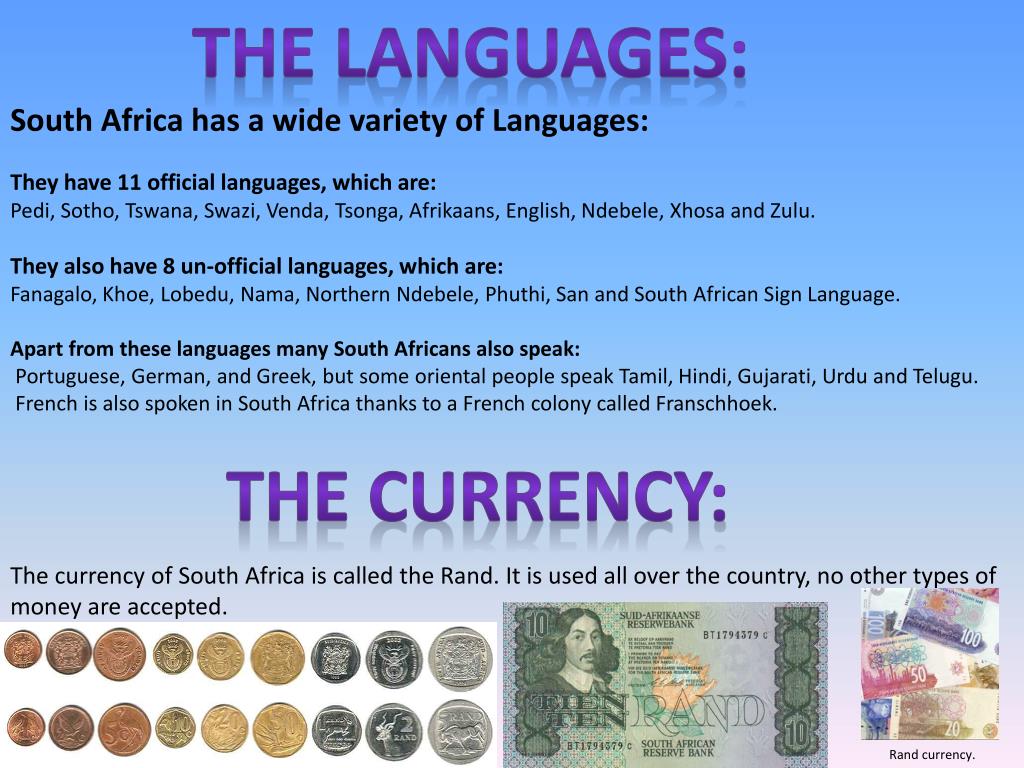 The languages: South Africa has a wide variety of Languages: They have 11 official languages, which are: Pedi, Sotho, Tswana, Swazi, Venda, Tsonga, Afrikaans, English, Ndebele, Xhosa and Zulu. They also have 8 un-official languages, which are: Fanagalo, Khoe, Lobedu, Nama, Northern Ndebele, Phuthi, San and South African Sign Language. Apart from these languages many South Africans also speak: Portuguese, German, and Greek, but some oriental people speak Tamil, Hindi, Gujarati, Urdu and Telugu. French is also spoken in South Africa thanks to a French colony called Franschhoek. The currency: The currency of South Africa is called the Rand. It is used all over the country, no other types of money are accepted. Rand currency.