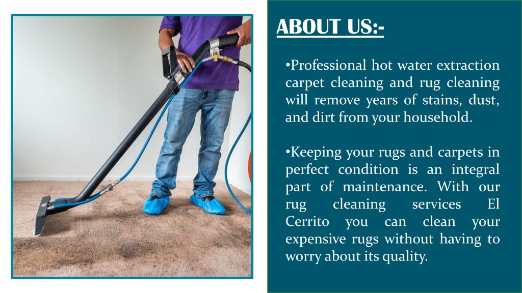 ABOUT US:- • Professional hot water extraction carpet cleaning and rug cleaning will remove years of stains, dust, and dirt from your household. • Keeping your rugs and carpets in perfect condition is an integral part of maintenance. With our rug cleaning services El Cerrito you can clean your expensive rugs without having to worry about its quality.