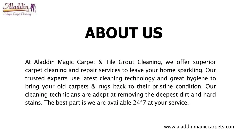 AtAladdin Magic Carpet & Tile Grout Cleaning, we offer superior carpetcleaning andrepairservicestoleaveyourhomesparkling.Our trusted experts use latest cleaning technology and great hygiene to bring your old carpets & rugs back to their pristine condition. Our cleaning technicians are adept at removing the deepest dirt and hard stains.Thebestpartisweareavailable24*7atyourservice. ABOUTUS www.aladdinmagiccarpets.com