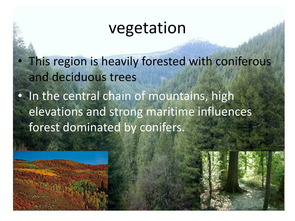 vegetation • This region is heavily forested with coniferous and deciduous trees • In the central chain of mountains, high elevations and strong maritime influences forest dominated by conifers.