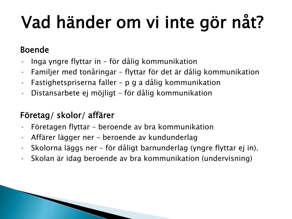 Vad händer om vi inte gör nåt? Boende • Inga yngre flyttar in – för dålig kommunikation • Familjer med tonåringar – flyttar för det är dålig kommunikation • Fastighetspriserna faller – p g a dålig kommunikation • Distansarbete ej möjligt – för dålig kommunikation Företag/ skolor/ affärer • Företagen flyttar – beroende av bra kommunikation • Affärer lägger ner – beroende av kundunderlag • Skolorna läggs ner – för dåligt barnunderlag (yngre flyttar ej in). • Skolan är idag beroende av bra kommunikation (undervisning)