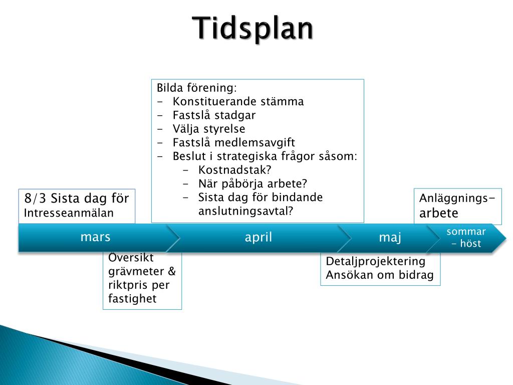 Tidsplan • Bilda förening: • Konstituerande stämma • Fastslå stadgar • Välja styrelse • Fastslå medlemsavgift • Beslut i strategiska frågor såsom: • Kostnadstak? • När påbörja arbete? • Sista dag för bindandeanslutningsavtal? Anläggnings-arbete 8/3 Sista dag för Intresseanmälan april maj mars sommar- höst Översikt grävmeter & riktpris per fastighet Detaljprojektering Ansökan om bidrag