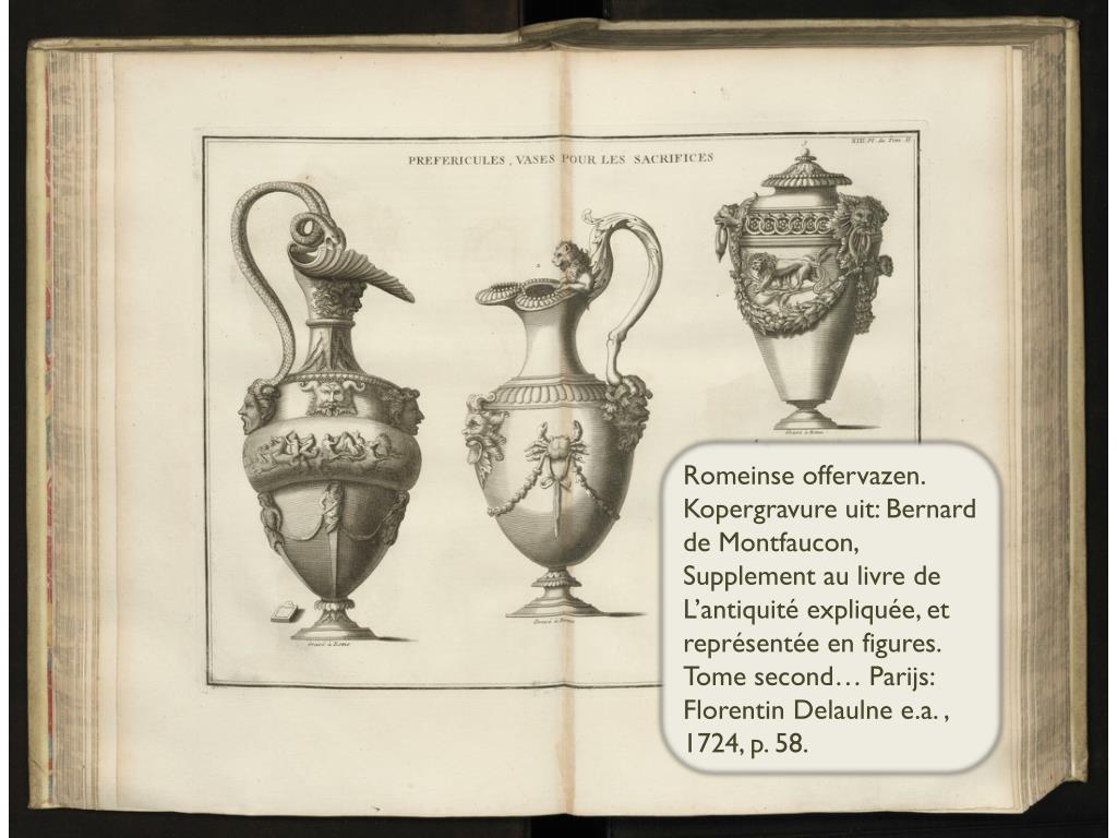Romeinseoffervazen. Kopergravureuit: Bernard de Montfaucon, Supplement au livre de L’antiquité expliquée, et représentée en figures. Tome second… Parijs: Florentin Delaulnee.a. , 1724, p. 58.