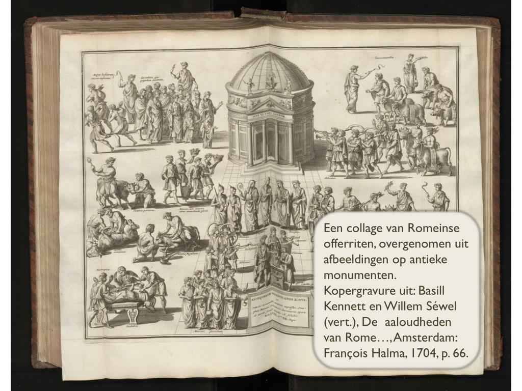Een collage van Romeinse offerriten, overgenomen uit afbeeldingen op antieke monumenten. Kopergravure uit: BasillKennett en Willem Séwel (vert.), De aaloudheden van Rome…, Amsterdam: François Halma, 1704, p. 66.