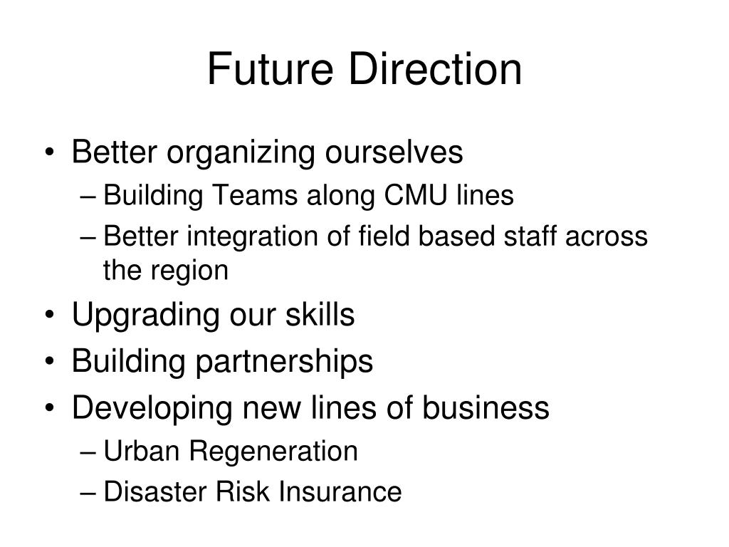 Future Direction • Better organizing ourselves • Building Teams along CMU lines • Better integration of field based staff across the region • Upgrading our skills • Building partnerships • Developing new lines of business • Urban Regeneration • Disaster Risk Insurance