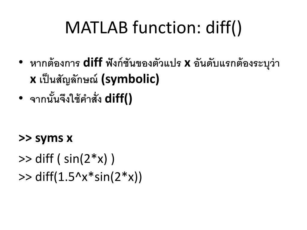 MATLAB function: diff() • หากต้องการ diff ฟังก์ชันของตัวแปร x อันดับแรกต้องระบุว่า x เป็นสัญลักษณ์ (symbolic) • จากนั้นจึงใช้คำสั่ง diff() >> syms x >> diff ( sin(2*x) ) >> diff(1.5^x*sin(2*x))