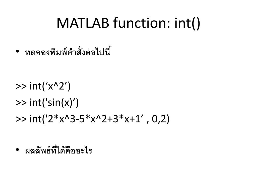 MATLAB function: int() • ทดลองพิมพ์คำสั่งต่อไปนี้ >> int(‘x^2’) >> int('sin(x)’) >> int('2*x^3-5*x^2+3*x+1’ , 0,2) • ผลลัพธ์ที่ได้คืออะไร