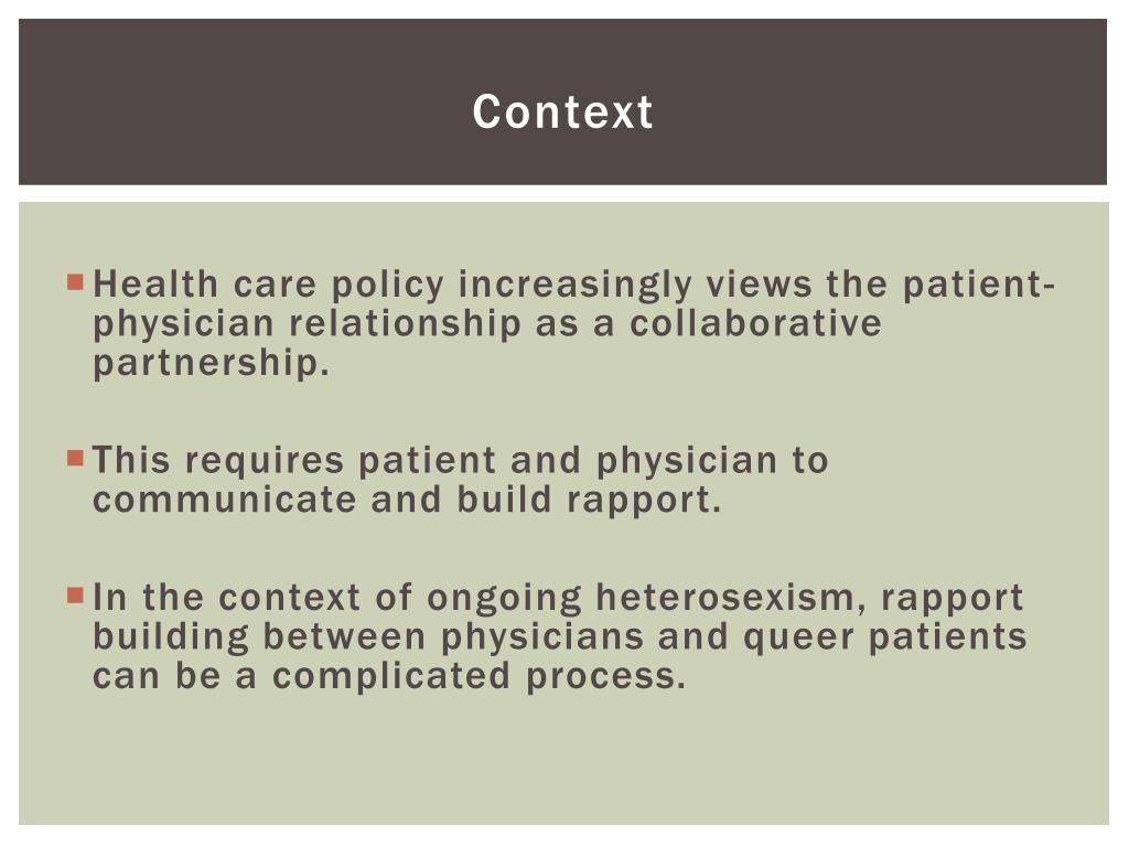 Context • Health care policy increasingly views the patient-physician relationship as a collaborative partnership. • This requires patient and physician to communicate and build rapport. • In the context of ongoing heterosexism, rapport building between physicians and queer patients can be a complicated process.