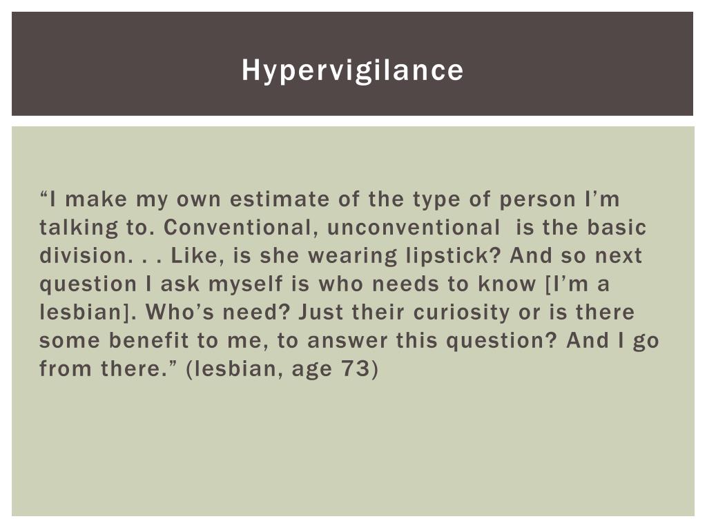 Hypervigilance “I make my own estimate of the type of person I’m talking to. Conventional, unconventional is the basic division. . . Like, is she wearing lipstick? And so next question I ask myself is who needs to know [I’m a lesbian]. Who’s need? Just their curiosity or is there some benefit to me, to answer this question? And I go from there.” (lesbian, age 73)