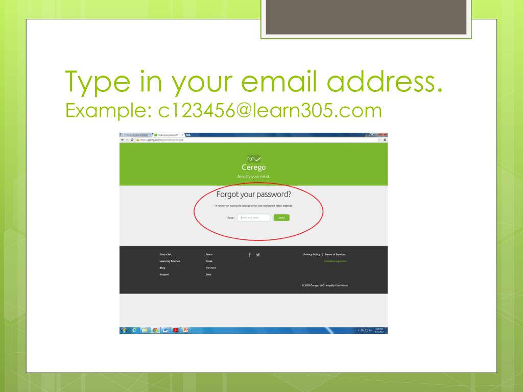 Type in the email address and password given to you by your teacher. Example: Email: c123456@learn305.com Password: Bird2222