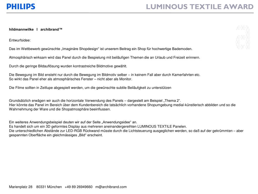 LUMINOUS TEXTILE AWARD hildmannwilke I archibrand™ Entwurfsidee: Das im Wettbewerb gewünschte „Imaginäre Shopdesign“ ist unserem Beitrag ein Shop für hochwertige Bademoden. Atmosphärisch wirksam wird das Panel durch die Bespielung mit beiläufigen Themen die an Urlaub und Freizeit erinnern. Durch die geringe Bildauflösung wurden kontrastreiche Bildmotive gewählt. Die Bewegung im Bild ensteht nur durch die Bewegung im Bildmotiv selber – in keinem Fall aber durch Kamerfahrten etc. So wirkt das Panel eher als atmosphärisches Fenster – nicht aber als Monitor. Die Filme sollten in Zeitlupe abgespielt werden, um die gewünschte subtile Beiläufgkeit zu unterstützen Grundsätzlich erwägen wir auch die horizontale Verwendung des Panels – dargestelt am Beispiel „Thema 2“. Hier könnte das Panel im Bereich über dem Kundenbereich die tatsächlich vorhandene Shopumgebung medial-künstlerisch abbilden und so die Wahrnehmung der Ware und die Shopatmosphäre beeinflussen. Ein weiteres Anwendungsbeispiel deuten wir auf der Seite „Anwendungsidee“ an. Es handelt sich um ein 3D geformtes Display aus mehreren aneinandergereihten LUMINOUS TEXTILE Panelen. Die unterschiedlichen Abstände zur LED-RGB Rückwand müsste durch die Lichtsteuerung ausgeglichen werden, so daß auf der gekrümmten – aber gespannten Oberfläche ein gleichmässiges „Bild“ erscheint. Marienplatz 28 80331 München +49 89 26949660 m@archibrand.com